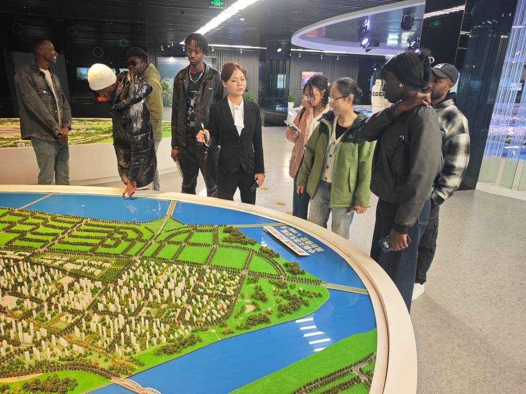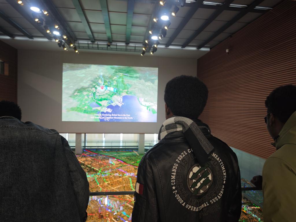 整个参观的高潮无疑是位于展馆核心区域的“天津市中心城区总体规划模型”。当留学生们走上观景平台,俯瞰按1:1000比例制作的、面积达数百平方米的巨型沙盘模型时,无不发出阵阵惊叹。随着灯光秀与宣传片的同步演示,天津“双城双港、相向拓展”的宏大空间战略布局变得一目了然。来自摩洛哥的艾雅兴奋地说:“这个模型太壮观了!它让我清晰地看到了我所在学校的位置、我常去的商业区,以及整个城市的交通网络,我对天津的城市结构有了更全面、更立体的认识。”